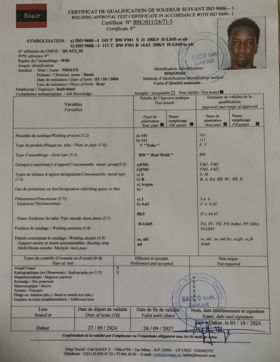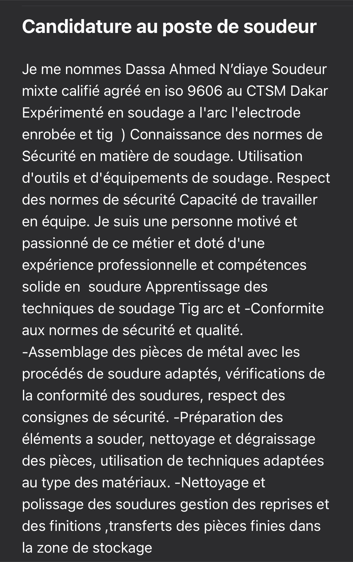 Je suis soudeur certifié en iso 9606-1 avec formation solide au centre technique soudure métallurgique avec de l’expérience professionnelle